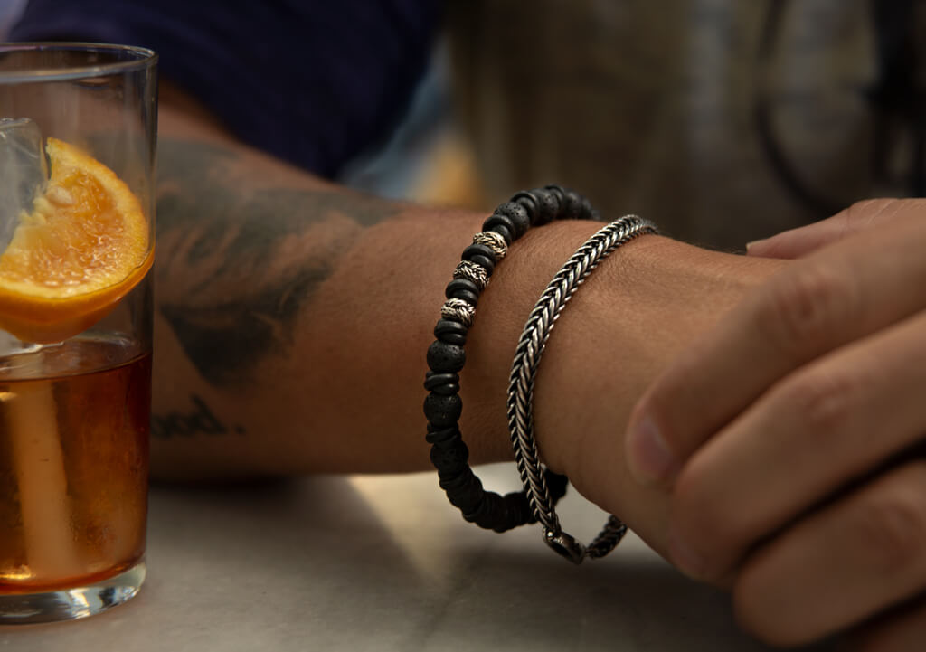 • Meet Florence. 24 grams of Silver with antiqued black oxidation finish on your wrist. Handmade in Italy with two strands of square foxtail chain, beautifully blending polished and blackened elements. The bracelet is secured with a carabiner closure featuring the Vaja logo. Every detail has been meticulously crafted by skilled artisans, drawing inspiration from traditional motifs.