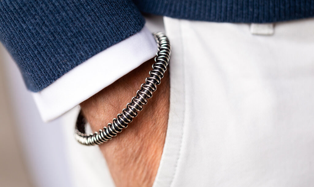 • Meet Dubai. A captivating open bangle bracelet in sterling silver. The core of Dubai features a solid piece of silver, expertly enveloped by .925 silver cords. The bracelet is adorned with Vaja patented knots in an antique finish at both ends. Made in Switzerland.