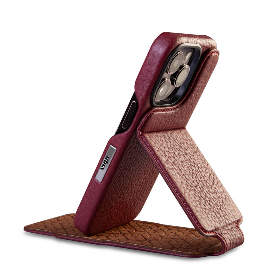 • Introducing the V-Mag Top Wrap. A foldable leather add-on that gives your device extra protection. If you already have a V-Mag Case, just snap on the top wrap to turn it into a top iPhone 15 Pro leather case with Top screen protection and Magical hidden magnetic closure. Need to travel lighter? Easily detach it while on the go.