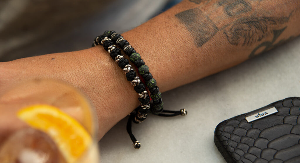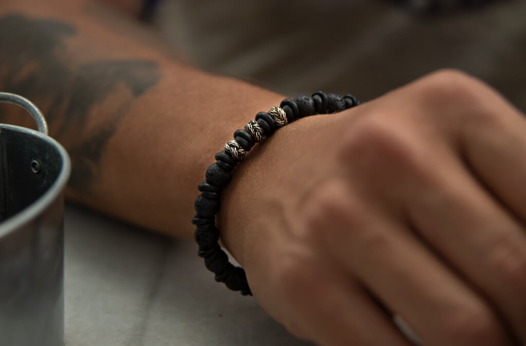 • Meet Athens. A captivating open bangle bracelet suitable for both men and women. This piece is handcrafted using genuine volcanic black rocks, three sterling silver knots, and intricately hand-knitted knots in black leather sourced from Patagonia. The bracelet showcases Silver Vaja logo knots with an antique finish on each end, adding a touch of charm. The lava rocks have a glowing effect at night due to their volcanic residue and special techniques. Made in Switzerland.